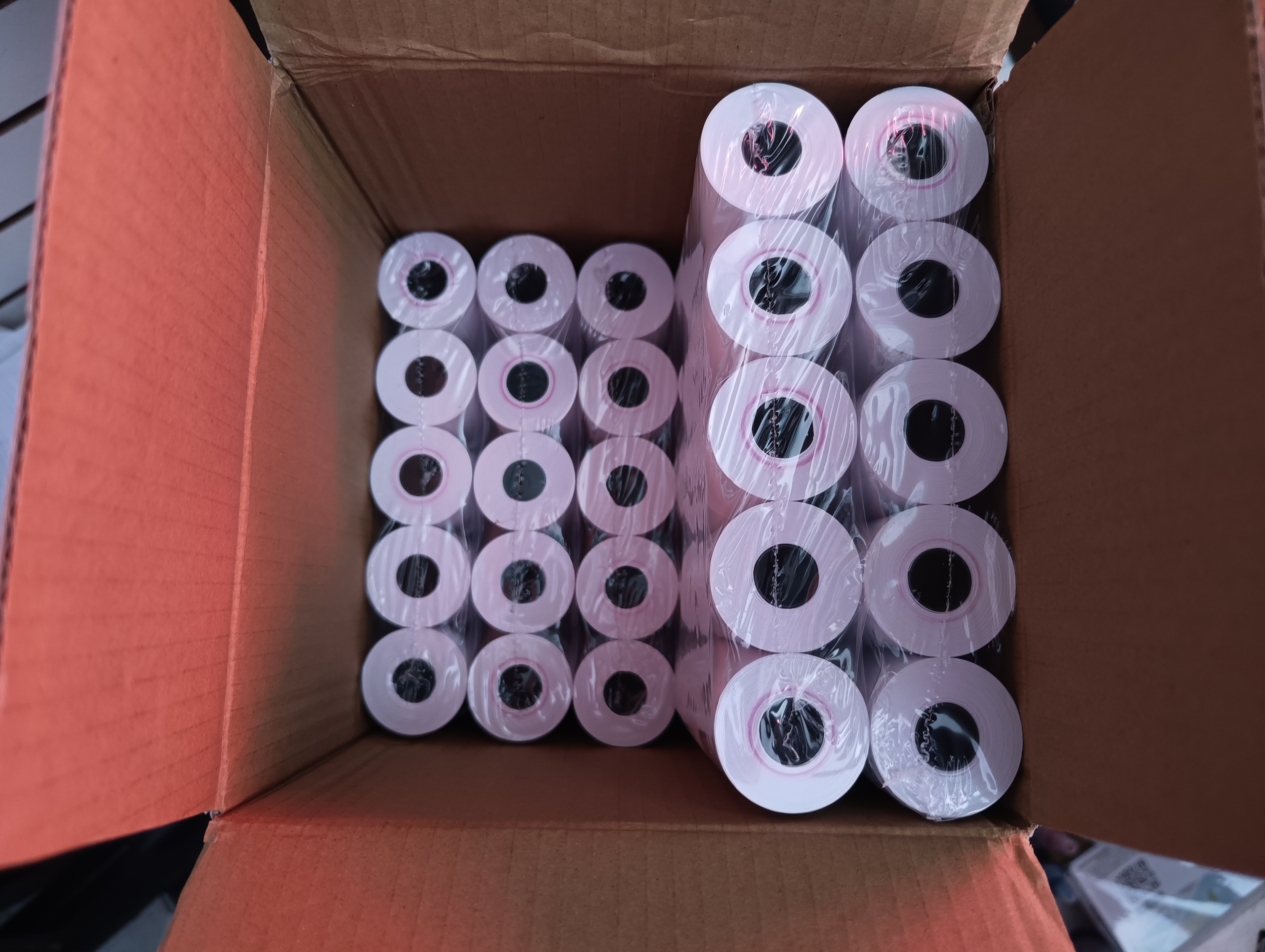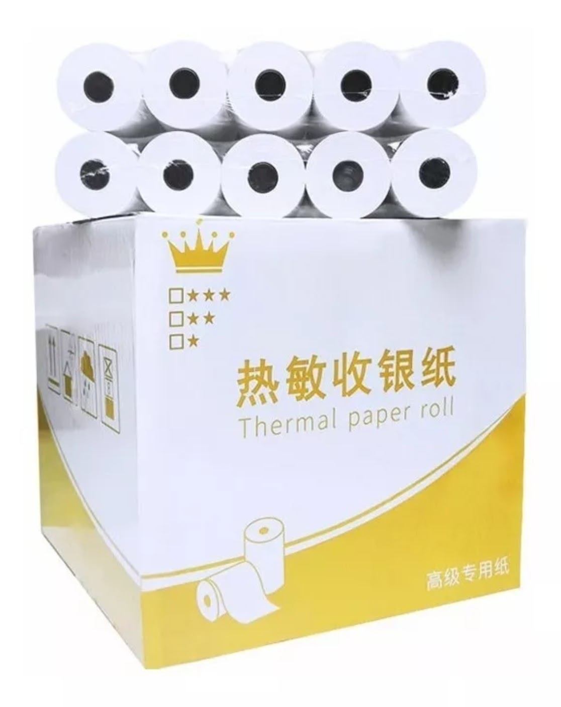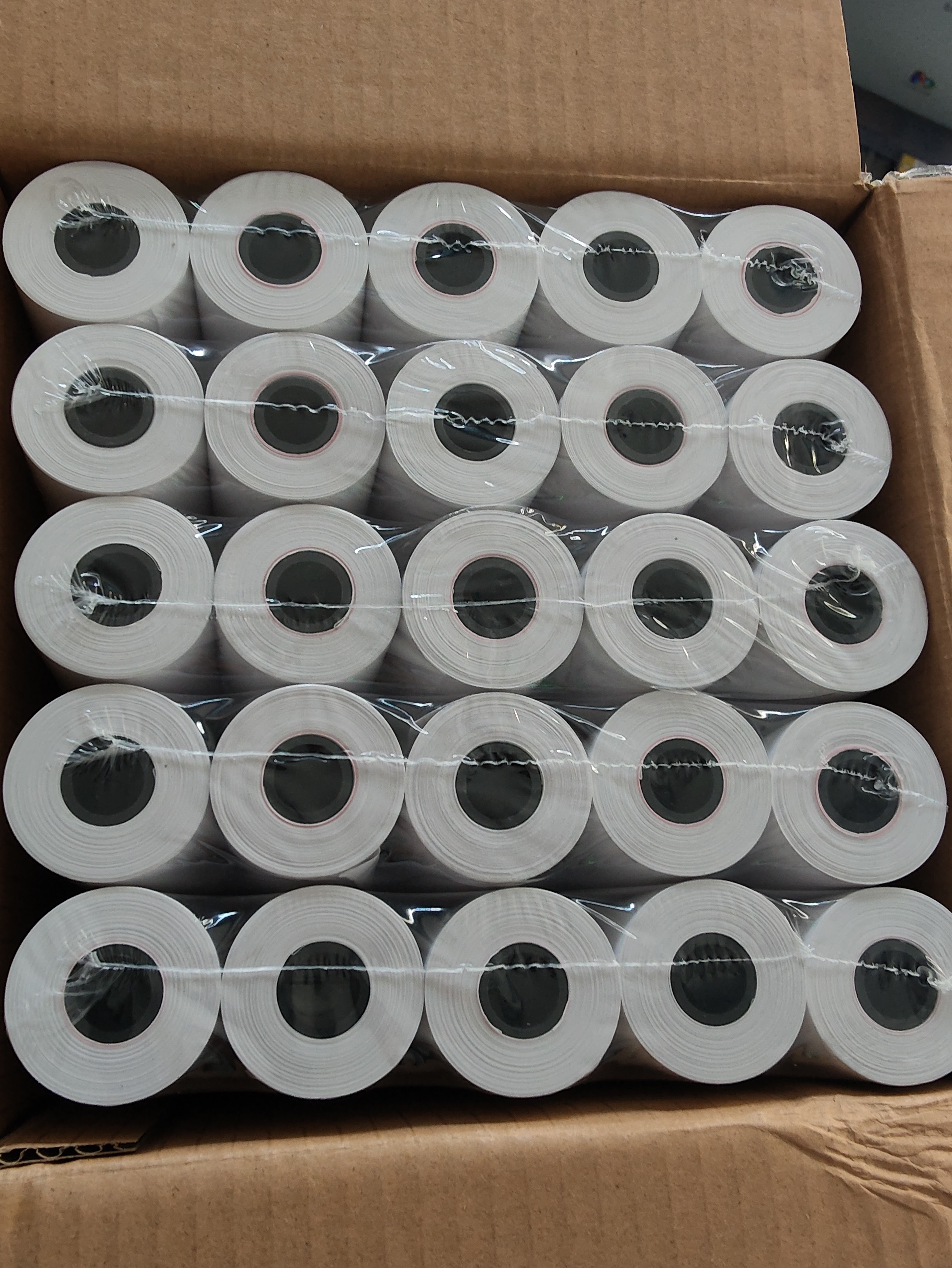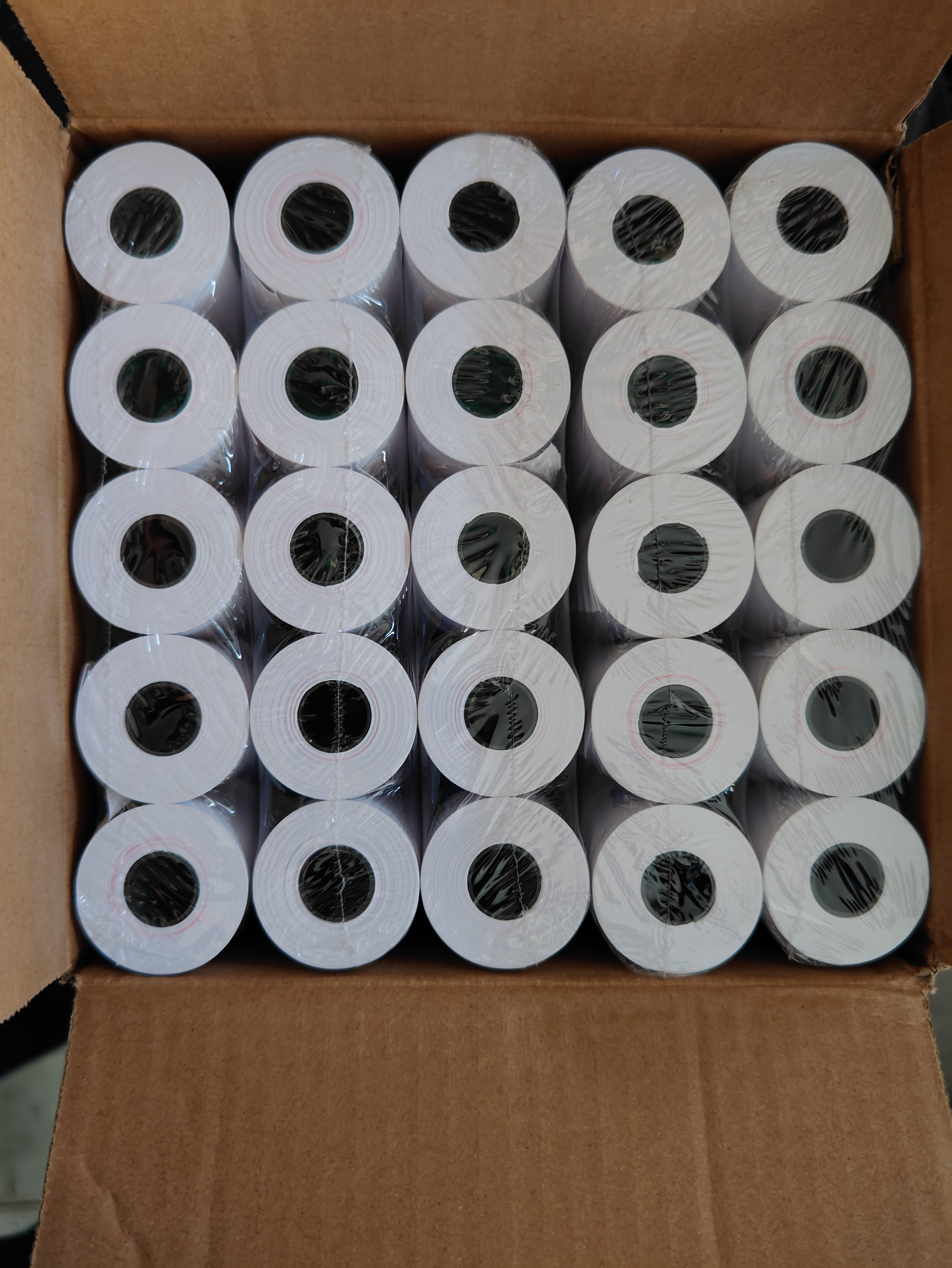La caja incluye 100 rollos de papel térmico para terminales bancarias o impresoras.
