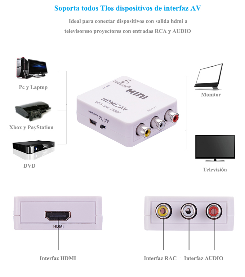 Convertidor Hdmi A Rca Av Audio Video Convertir la Señal de HDMI a Señal Normal RCA, ayudandote a Convertirla con la Calidad de la Señal HDMI, funciona para concetar tu TV/VHS/VCR/DVD para que el convertidor de señal nesesita cambiar el boton lateral a modo NTSL A PAL,